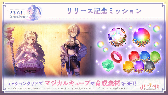 『Crescent Memoria』 開幕を記念して、「Crescent Memoria開幕記念ミッション」を開始いたしました。ログインや、「舞台装置の魔女」「魔獣編」MainのBOSSバトルクリアなどのミッションを達成することで、プリズムオーブやプリズムコアなどの育成素材や、マジカルキューブなどが獲得可能です。