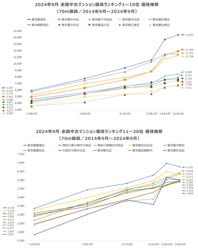 「不動産×WEB×ビッグデータ」の領域で、さまざまな不動産テックサービスを展開する株式会社ワンノブア カインド(本社:東京都港区、代表取締役社長:川島 直也、以下当社)は、当社が運営するマンション情報サイト 「マンションレビュー」の保有データを元に、2024年9月の全国市区町村における中古マンションの相場を 調査。坪単価をベースに70m²の価格に換算した「中古マンション価格」*1 と価格ランキング上位20件について 過去10年間の価格推移、および1年前からの価格上昇率を表す「騰落率」のランキングを発表いたします。