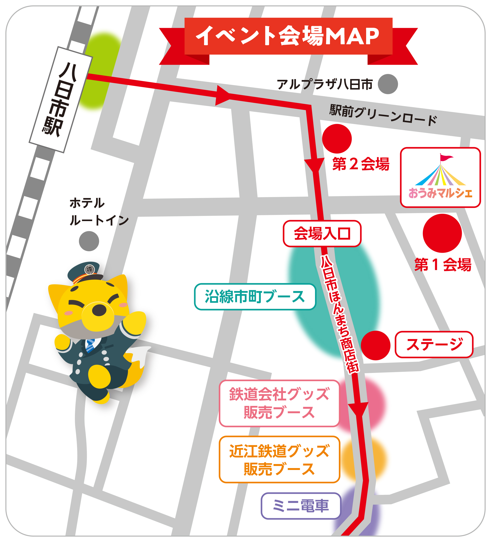 近江鉄道マスコットキャラクター「駅長がちゃこん」がステージ前に登場します。