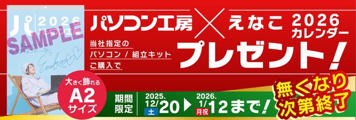 パソコン工房・グッドウィルを運営する株式会社ユニットコム(代表取締役:端田 泰三、本社:大阪市浪速区)は、全国のパソコン工房店舗・WEB通販サイトにて、(当社指定条件を満たし)対象パソコンまたは対象組立キットをご購入いただいたお客様へ、「パソコン工房 × えなこ 2026 カレンダー」を先着でプレゼントするキャンペーンを2025年12月20日(土)から2026年1月12日(月・祝)までの期間限定で開催いたします。