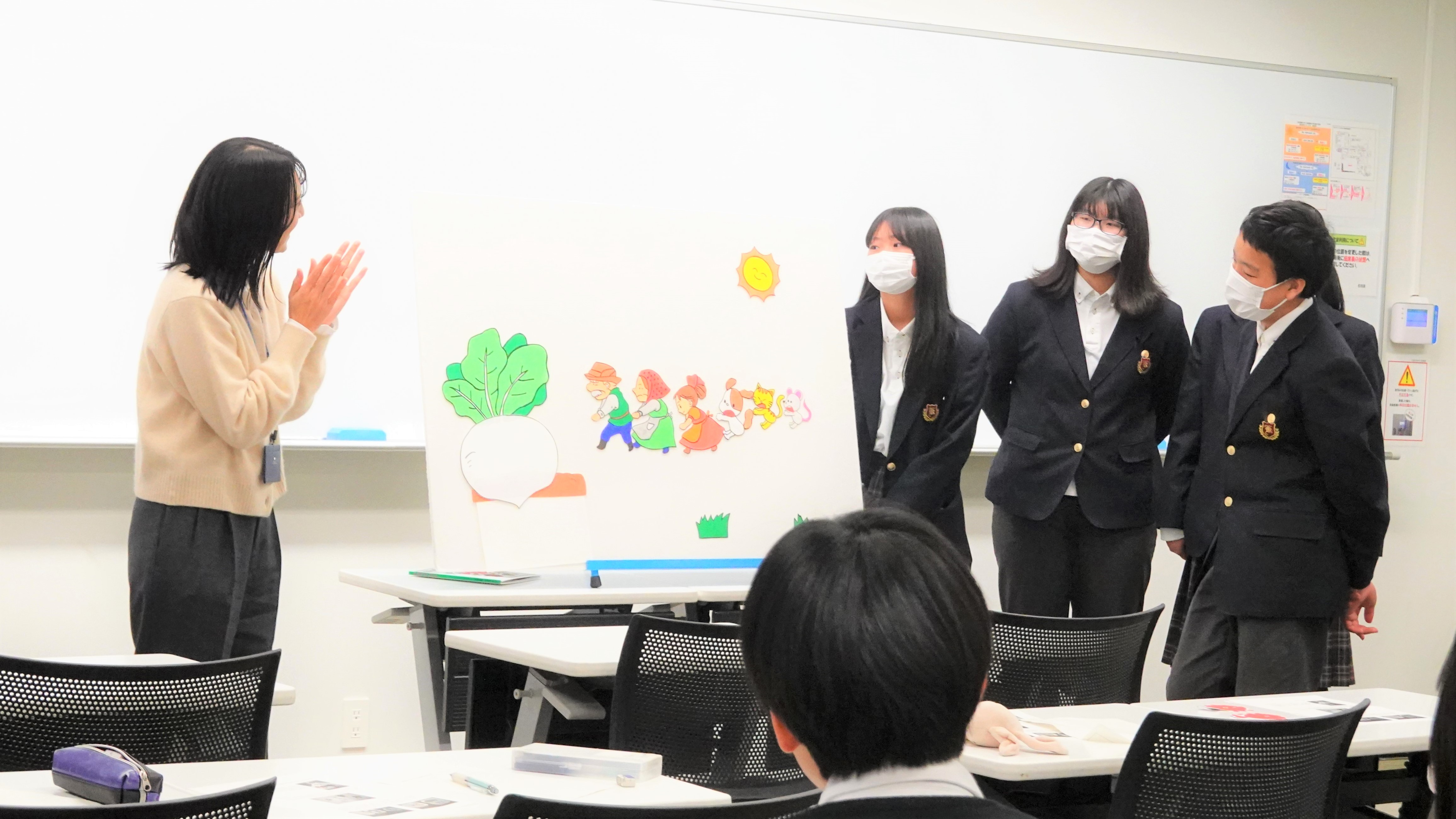 幼児保育学科の模擬授業「乳幼児が楽しめる絵本やパネルシアターなどの見せ方や演じ方について学ぼう」