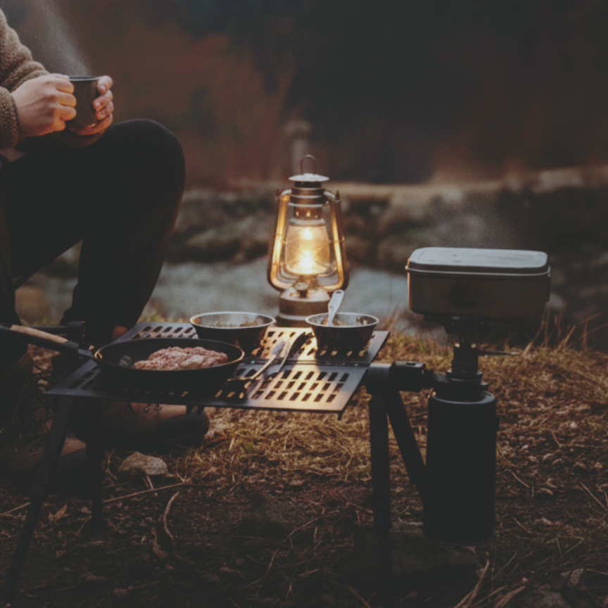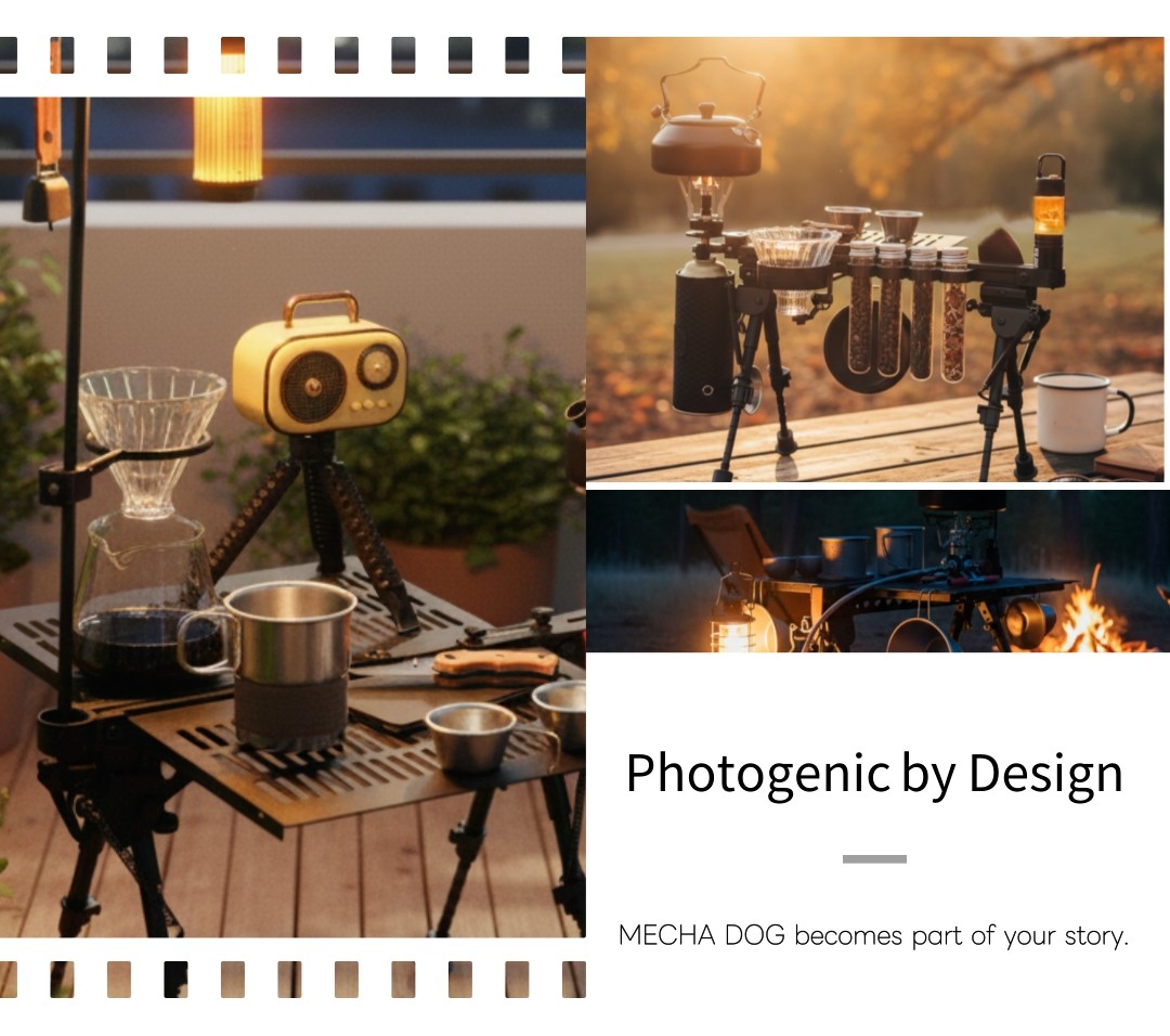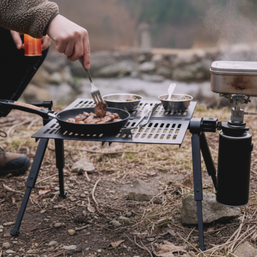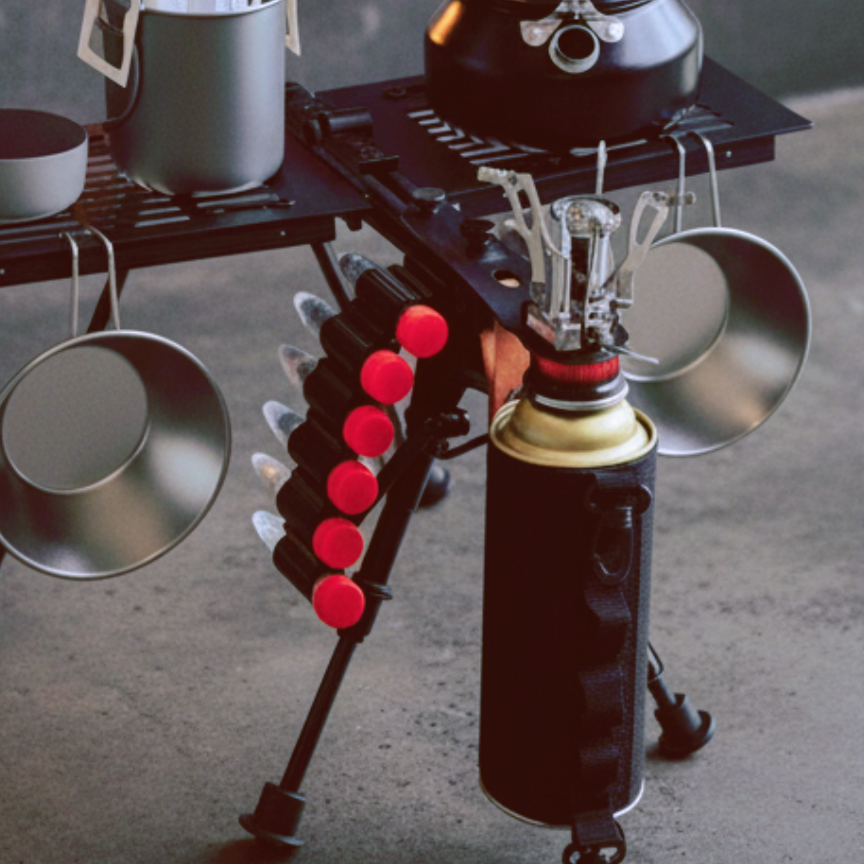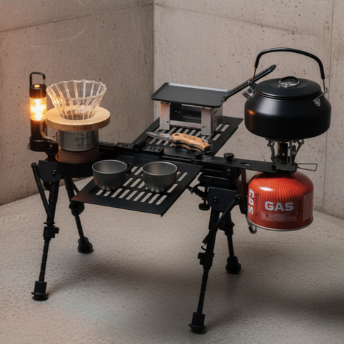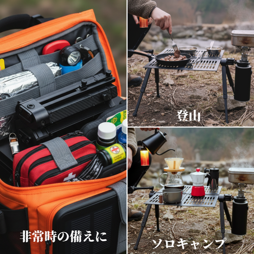 モジュラー設計によりサイドテーブルやドリンクホルダーなど各種オプションをクイック装着できるため、撮影機材や調理ギア、キャンプ小物との組合せが自在。屋内ではサイドテーブルや撮影小道具として、アウトドアでは軽量な作業台や、OD缶を用いた非常時の簡易キッチンとしても応用可能で、日常とアウトドア、そして緊急時の備えまでを見据えた汎用性が評価されている。