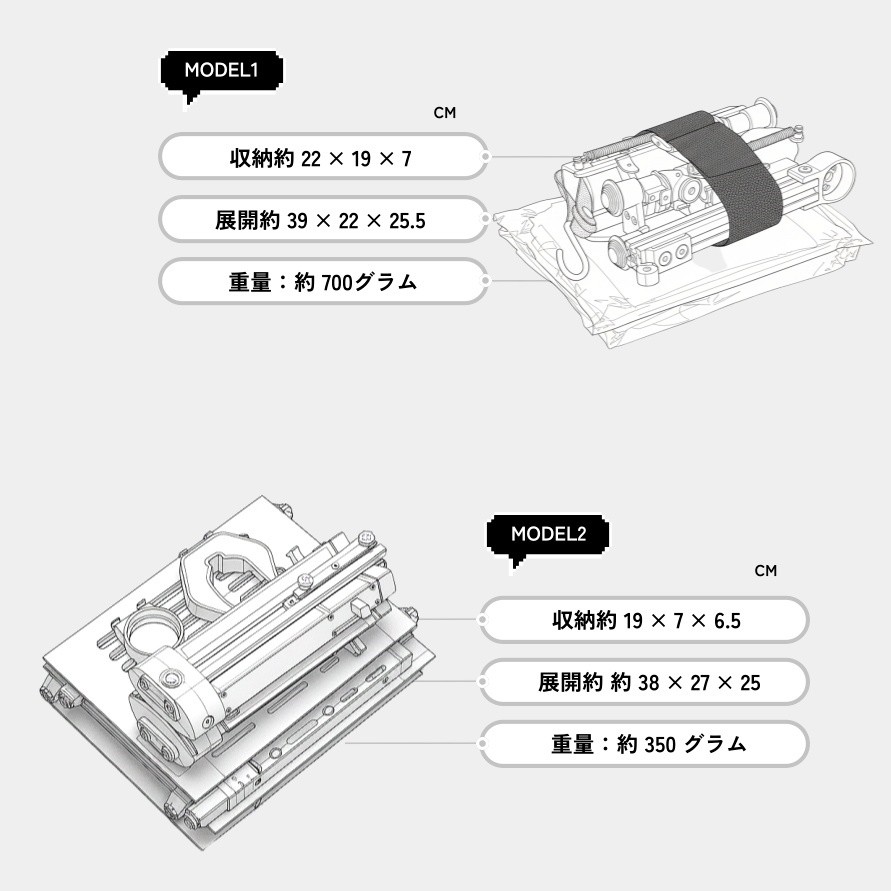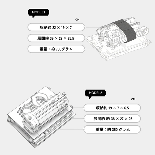 本製品は2つのモデルを展開。Model1は映えを重視した仕様で約700g、Model2は携行性に優れ約350gと、用途に応じて選択できるのが特徴だ。