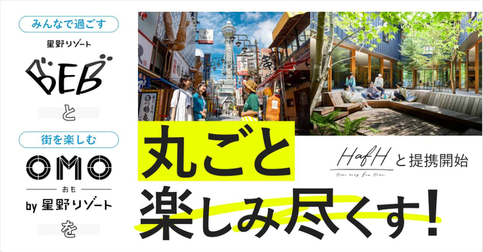 株式会社KabuK Style(本社:長崎県長崎市、代表取締役:砂田 憲治、以下「KabuK Style」)と国内外で56施設を運営し、旅を楽しくする星野リゾート(長野県軽井沢町/代表:星野 佳路)は、新たな旅行市場の創造を目的に資本業務提携を開始しました。同時に、4月13日から、KabuK Styleが提供している旅のサブスクリプションサービス「HafH(ハフ)」で、星野リゾートが展開する旅のテンションをあげるホテル「OMO(おも)」と、ルーズに過ごす滞在を提案するホテル「BEB(ベブ)」の、全13施設の予約受付を開始します。今後も、予約可能施設の拡大を順次予定しています。