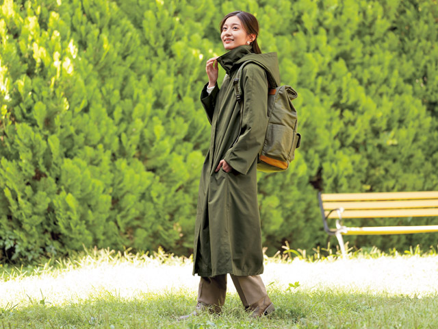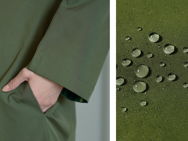 落ち着いたカーキカラーで、オフィスカジュアルにも合わせやすく、撥水加工、ポケット付きと実用面も充実!