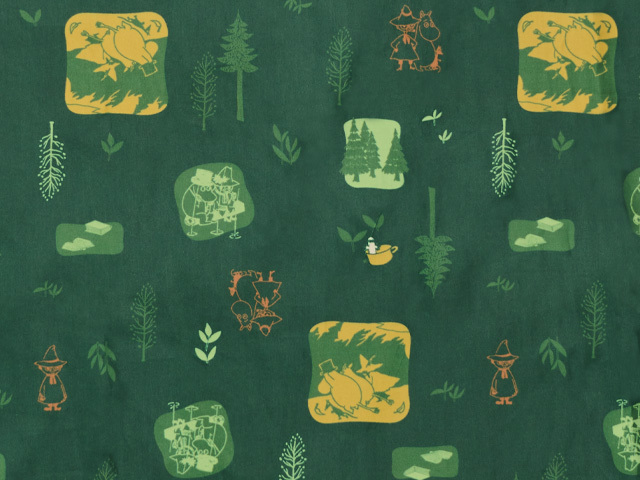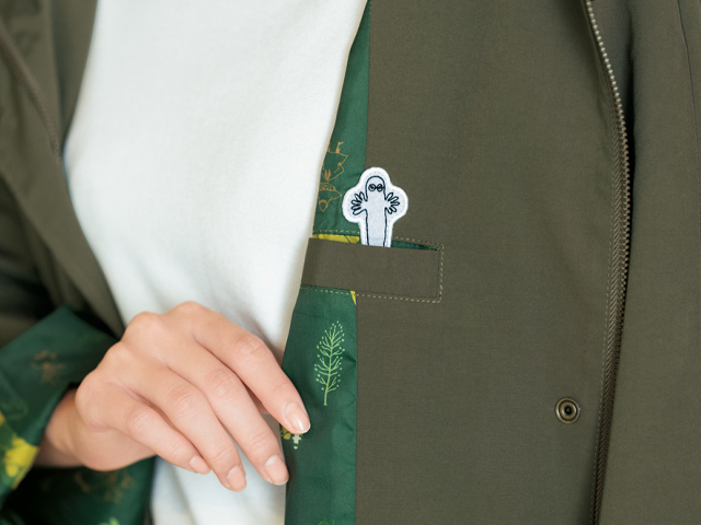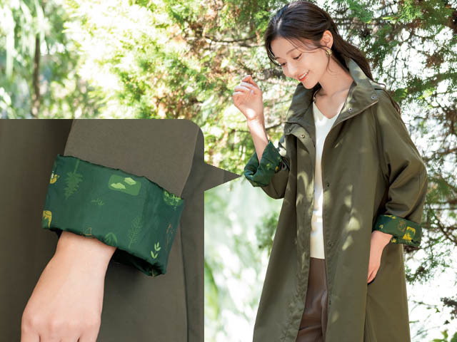 裏地は、このコートのためにデザインされたオリジナル柄。濃い目のフォレストグリーンにスナフキンはもちろん、ムーミントロール、ムーミンパパなど、ムーミン谷の仲間たちがプリントされています。