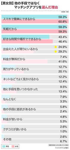 では、「なぜ他の手段ではなく、マッチングアプリを選んだのか」について聞いてみました。すると、男女ともに「スマホで簡単にできるから」「気軽だから」「好きな時間・好きな場所でできるから」が3トップとなり、いずれも50〜60%の人から支持されました。