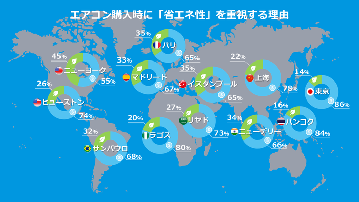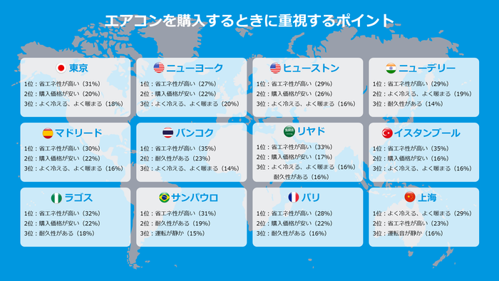 エアコン購入時に最も重視するポイントは、12都市中11都市で「省エネ性」 「環境への負荷」を最も気にしているのはニューヨーク