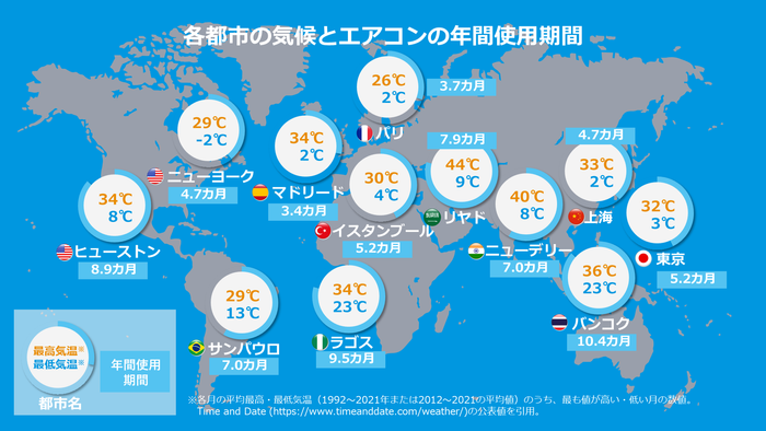 日本では、気温が高い数カ月のみエアコン(冷房)を使用する人が多いですが、世界では年間でどのくらいの期間使用されているのでしょうか?