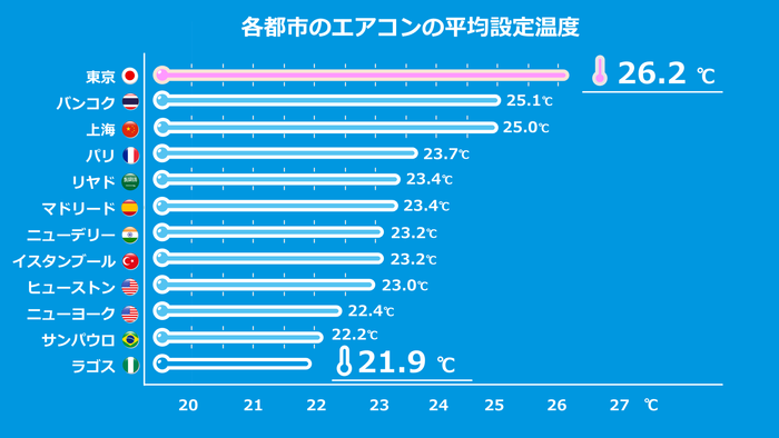 エアコン(冷房)の「設定温度」が最も高い都市は平均26.2℃の東京 最も低かったラゴス(ナイジェリア)は平均21.9℃で、その差は4.3℃!