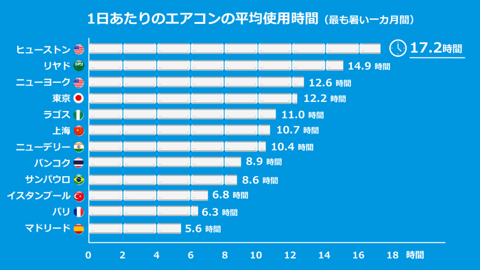 ヒューストン(アメリカ)では、暑い時期に約40%の人がエアコンを24時間使用し、1日あたりの使用時間の平均は最も長い17.2時間