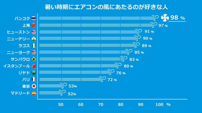 さらにエアコンの使い方の違いを探るために、「暑い時期にエアコン(冷房)の風にあたるのが好きですか」と聞きました。その結果、「とても好き」もしくは「どちらかといえば好き」と回答した人たちの合計割合が12都市の中で最も多いのはバンコク(タイ)で、98%となりました。上海(中国)、ヒューストン(アメリカ)、ニューデリー(インド)、ラゴス(ナイジェリア)、ニューヨーク(アメリカ)、サンパウロ(ブラジル)、イスタンブール(トルコ)でも8割以上の人たちが「とても好き」もしくは「どちらかといえば好き」と回答しています。ほとんどの都市においてエアコンの風にあたって涼むことが好まれる傾向にある一方、東京とマドリード(スペイン)では好きな人と嫌いな人がほぼ半数ずつで、好みが分かれる結果となりました。