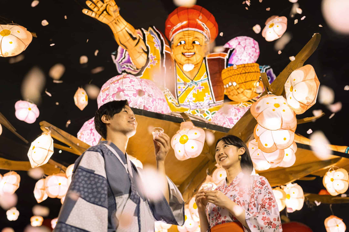 【青森屋】ねぶた花咲かじいさんが約200個のりんごの花型灯篭を咲かせる「たんげ花咲かまつり」開催 ~桜柄の浴衣を着て、花見酒片手にゆったり過ごす~|期間:2023年4月5日~5月31日