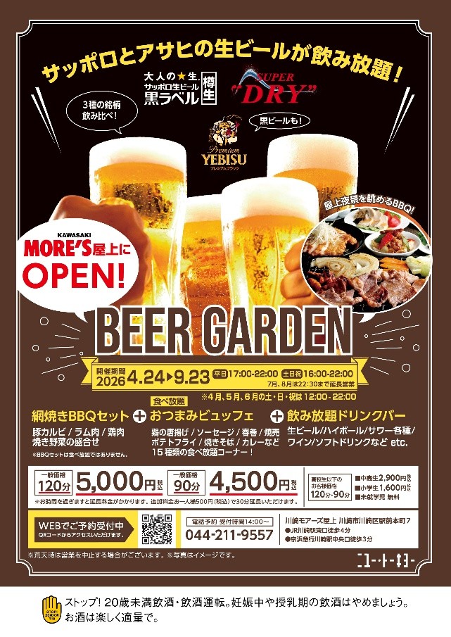 川崎モアーズ屋上ビヤガーデンが4月24日(金)にオープンいたします。毎年、近隣のオフィスワーカーからご家族連れまで幅広いお客様にお楽しみいただいております。卓上グリルで焼き上げる豚カルビ・鶏肉・ラム肉のBBQセットをメインに、唐揚げ、焼きそば、フライドポテトなど多数のおつまみが食べ放題。さらに、サッポロ黒ラベル、アサヒスーパードライ、エビスブラックの人気3銘柄を生で飲み比べできる贅沢仕様。120分・90分から選べるプランで、お腹も心も大満足!