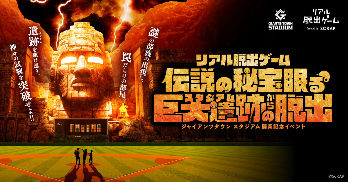全世界で累計1,490万人以上を動員しているリアル脱出ゲームを企画制作する株式会社SCRAP(本社:東京都渋谷区、代表:加藤隆生)は、株式会社よみうりランドと共催で、『伝説の秘宝眠る巨大遺跡からの脱出』をジャイアンツタウンスタジアム(東京都稲城市)にて9月5日(金)、6日(土)、7日(日)に開催します。