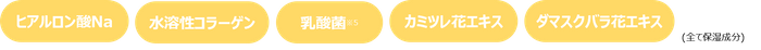 ※1メイク効果による※2 (HDI/PPG/ポリカプロラクトン)クロスポリマー、シリカ(全て粉体基剤)※3 加水分解ヒアルロン酸、ヒアルロン酸ヒドロキシプロピルトリモニウム、アルギン酸Na、オウゴン根エキス(全て被膜剤)※4 被膜効果によりお肌への付着を防ぐ ※5 乳酸桿菌