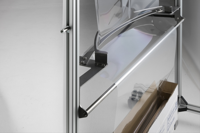 巻き取ったフィルムは足元の専用ケースにロール状に納められ、使用後は専用ケースごとモーターから取り外して廃棄できます。使用したフィルムに一切、手を触れることなく、アクリル版や貼付シートのように拭き取り清掃の必要もありません。