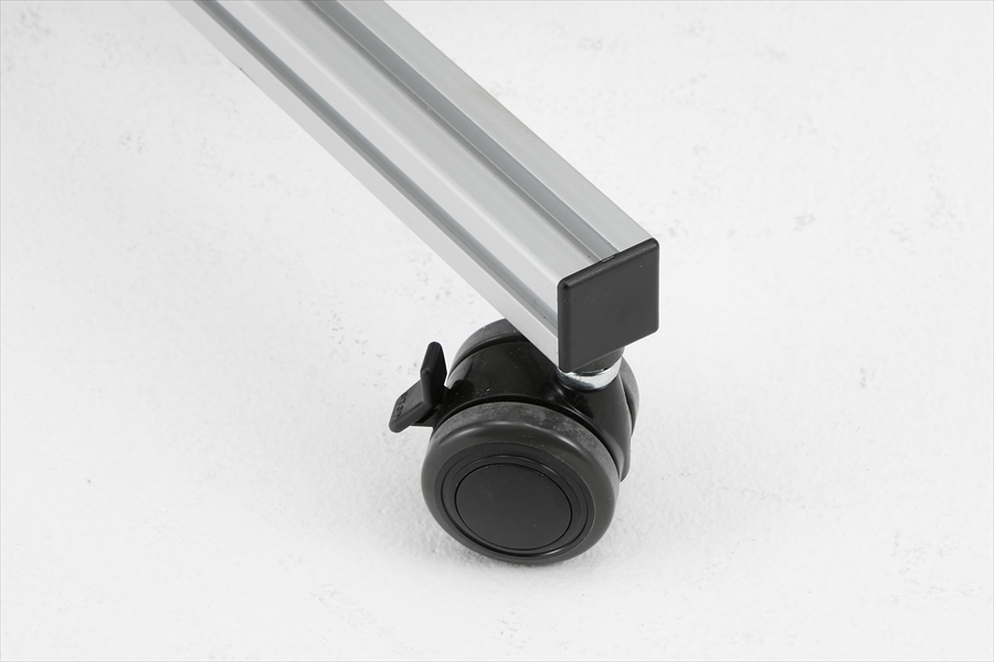 ストッパー付き45mmのキャスター付きで、移動も固定も自在。アルミ製の門型フレームを採用していて軽量です。