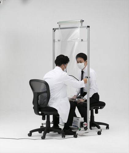 新型コロナウイルス感染予防の強化に活躍する 電動巻取り式の診察対面スタンド。 飛沫に触れナイ、浴びナイ、手間いらナイを実現した 『ABINAI(アビナイ)』をお披露目します。 ワクチン接種、各種診察、窓口業務など 医療従事者の感染リスクを低減します。 2021年2月インテックス大阪で開催される 「医療と介護の総合展」にて初お披露目