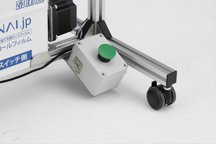 フィルムの巻取りには「足踏みスイッチ」による電動巻取り式を採用。1回踏むごとに使用した長さを約5秒で巻取り、新しいフィルムに交換が可能です(巻き取り量は1cm単位で調整可能)。フィルムにもスイッチにも手を触れずに交換できるため、接触による感染リスクを回避することができます。