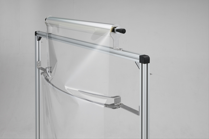 患者様の上半身を覆う部分のロールフィルムを、独自の技術で弓なり状に湾曲させました。患者側から飛んできた飛沫が跳ね返される構造となっています。また、フィルムなので両サイドから手を伸ばし、内側に縮めることもできるのでワクチン接種や診察に伴う動作の妨げにもなりません。