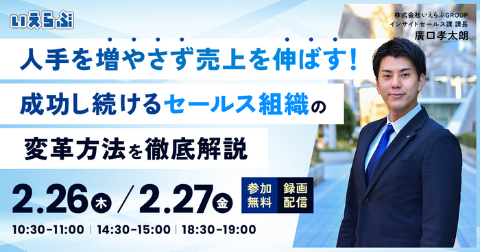 不動産業界特化のDX支援サービスを展開する株式会社いえらぶGROUP(本社:東京都新宿区、代表取締役:岩名泰介、以下「いえらぶGROUP」)は、2月26日(木)・27日(金)の2日間、録画配信(ライブ形式)にて、「人手を増やさず売上を伸ばす!成功し続けるセールス組織の変革方法」セミナーを開催いたします。
