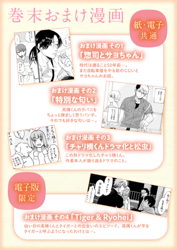 また、巻末のおまけ漫画に「惣司とサヨちゃん」「特別な匂い」「チャリ橋くんドラマ化と松虫」、電子版限定「Tiger&Ryohei」を収録。