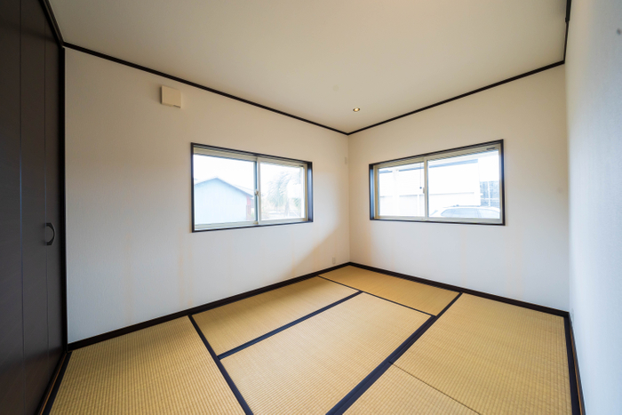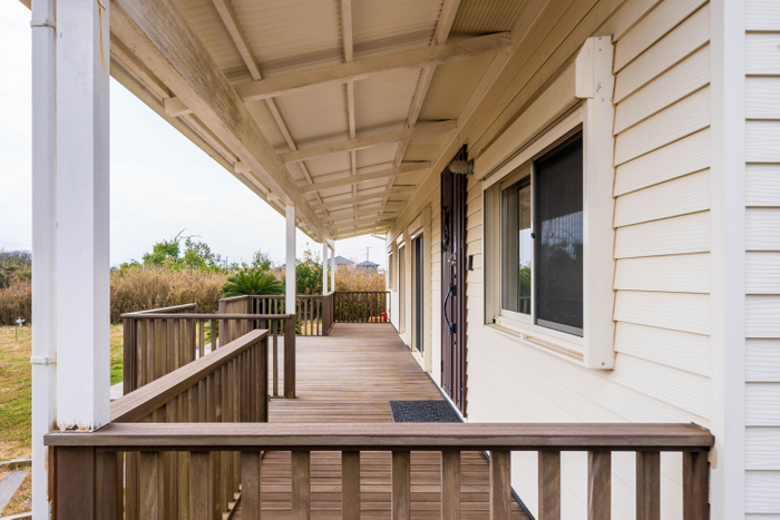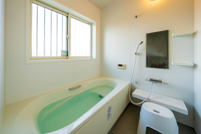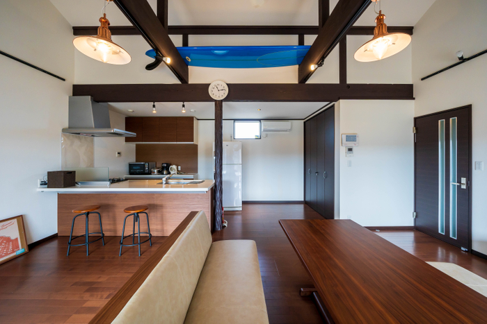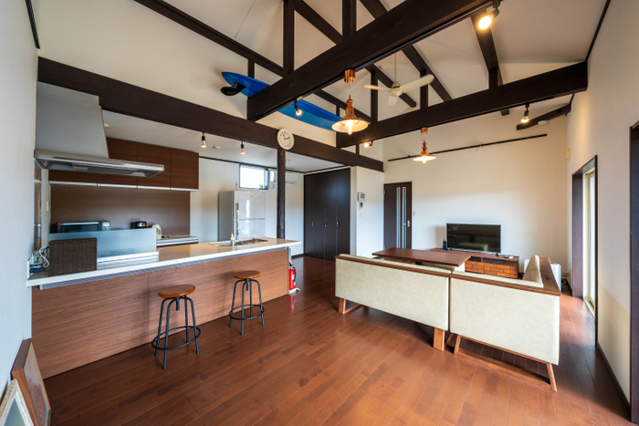 別荘の外観は九十九里の美しい砂浜を思わせる白を基調とし、232坪ある敷地の芝庭を見渡せるウッドテラスでは、日常から離れたシーサイドリゾートらしい雰囲気がお楽しみいただけます。屋内は約96㎡の2LDKで、リビング・ダイニング・キッチンスペースは、天井が高く広々とした空間でスローライフを楽しむサーフハウスの開放感を演出しています。2室の寝室は和室(6畳)と洋室(8畳)で、最大7名様までの宿泊が可能です。洋室には大きなウォークインクローゼットを備えており、荷物が多くなる長期の滞在でも快適にお過ごしいただけます。また、外流しシャワーが備わっているので、サーファーの方にとっては利便性が高く、特におすすめな施設となります。