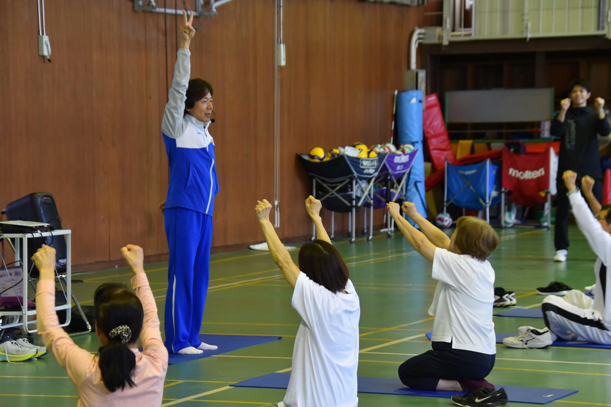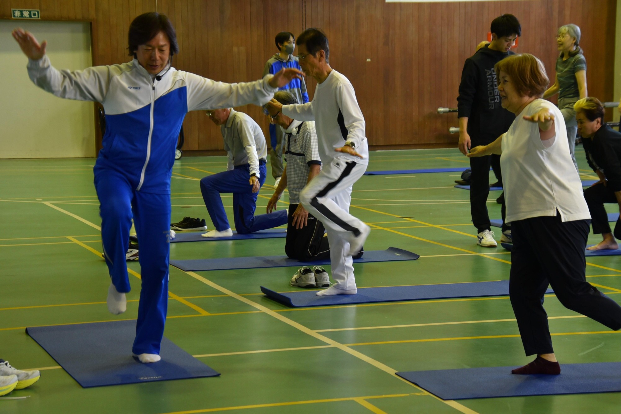 講義の前半と後半の間に開催された「健康実践教室」では、新カリキュラム「プロフェショナリズム」でボランティアを学ぶ2年生5人も加わり、学生たちが受講者をサポートしながら佐藤特任教授の指導を受けました。「忍者座り」から立ち上がり、片足でバランスを取る筋肉トレーニングや、2人1組になっての多彩な運動、頭の体操や手遊びなどに学生や受講者たちは1時間にわたって取り組み、心地よい汗を流していました。