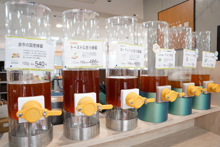ミールミィで人気の量り売り蜂蜜。お好きな蜂蜜をお好きな量だけ購入できます。今回のリニューアルでは、系列店舗の中で最多となる常時6種類を展開。定番の「金市の国産蜂蜜」と「毎月変わるおすすめ蜂蜜」に加え、大人気の「トーストに合う蜂蜜」「ヨーグルトに合う蜂蜜」が常時提供できるようになりました。