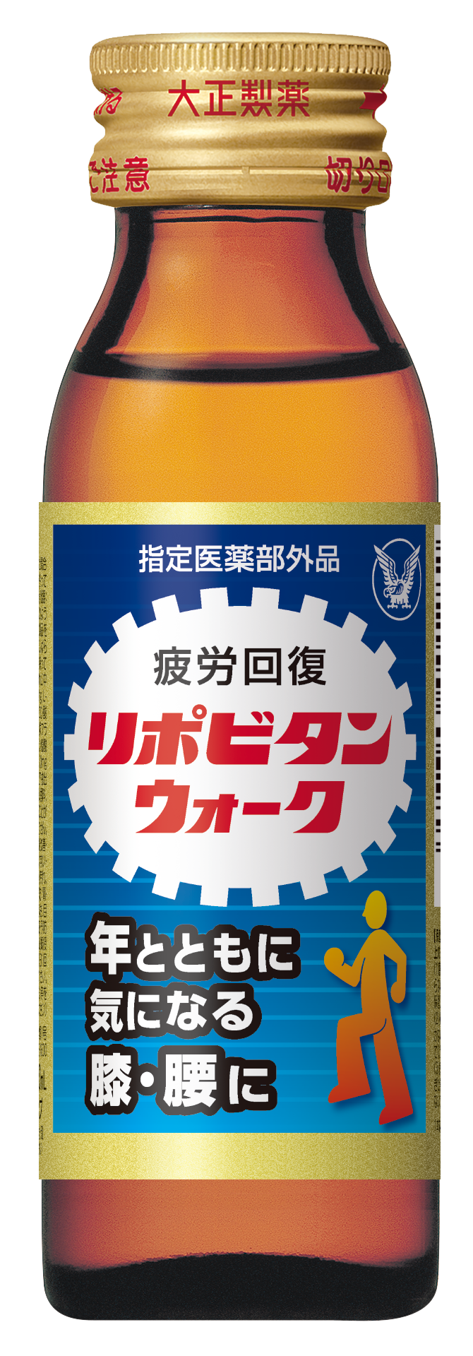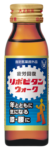 『リポビタンウォーク』は、「疲労回復」をサポートする成分タウリン、ビタミンB群(B1・B2・B6)に加え、「加齢に伴う膝腰の不調の改善・予防」をサポートする成分コンドロイチン、カルシウムと、丈夫な体を維持するのに必要な必須アミノ酸(BCAA※2)を配合した50mLミニドリンク剤(指定医薬部外品)です。