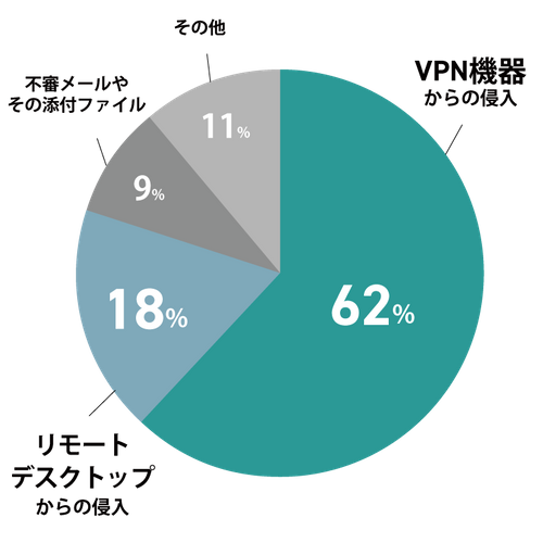近年、企業の持つデータを暗号化するだけでなく、データを盗み取った上で「対価を支払わなければデータを公開する」などと金銭を要求するランサムウェアの被害が相次いでいます。その背景には、従来のUSB・WEB・メールに続く第四の侵入経路として企業の管理不十分な外部公開資産(ネットワーク機器やサーバ)が悪用されている状況があります。特にVPN機器からの侵入をきっかけとする被害は、被害総数の半数以上を占めており、企業にとって大きな脅威となっています。