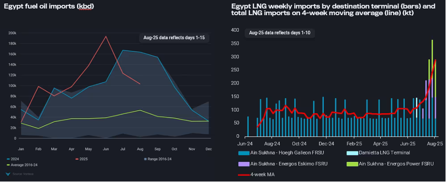 さらに8月後半には地中海沿岸のダミエッタに新たなFSRUが設置される予定で、エジプトのLNG輸入能力は年間2,000万トン超に拡大する。これは7月以前の水準の5倍以上となる。また8月初旬、エジプトはイスラエルのリバイアサンガス田(NewMed Energy)からの将来的なパイプライン輸入量を大幅に増やすことで合意した。ただし追加供給は新たなパイプライン接続が完了する2026年以降となる見込みである。輸入天然ガスのコストは燃料油より安価なため、エジプトの発電用燃料油依存度はさらに低下する可能性が高い。