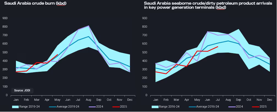 サウジアラビアの発電所(シュアイバ、ラービグ、アル・シュカイク、ジッダ)における海上輸送の原油・コンデンセートおよび重油系石油製品(DPP)の到着量は予想を下回り、6月・7月は過去9年平均を下回った。