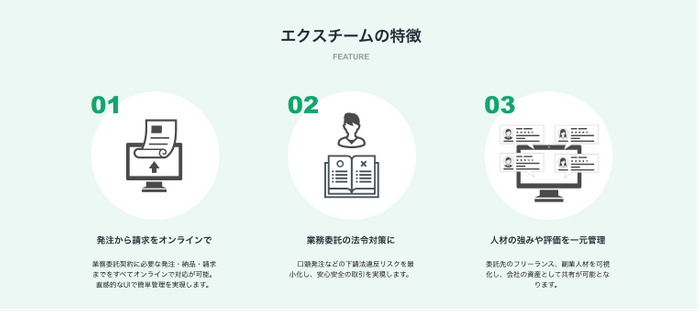 エクスチームとは、「external:外部の、外の」と「team:チーム、仲間」とを組み合わせた名称で、フリーランス・副業人材などの外部人材を活用している企業向けの業務委託契約管理に特化したツールです。発注から納品、請求までを一元管理し、業務委託内容や実績を全て可視化します。フリーランス・副業人材とのやり取りを集約・管理することで、請求漏れや契約書紛失なども防ぎます。また、外部人材情報をデータベース化することにより、業務委託先の発注履歴や報酬額、評価などを社内共有できるタレント管理機能も有しています。