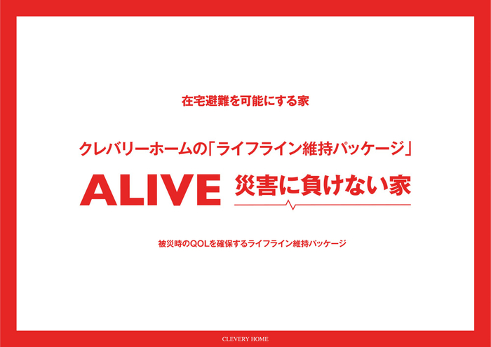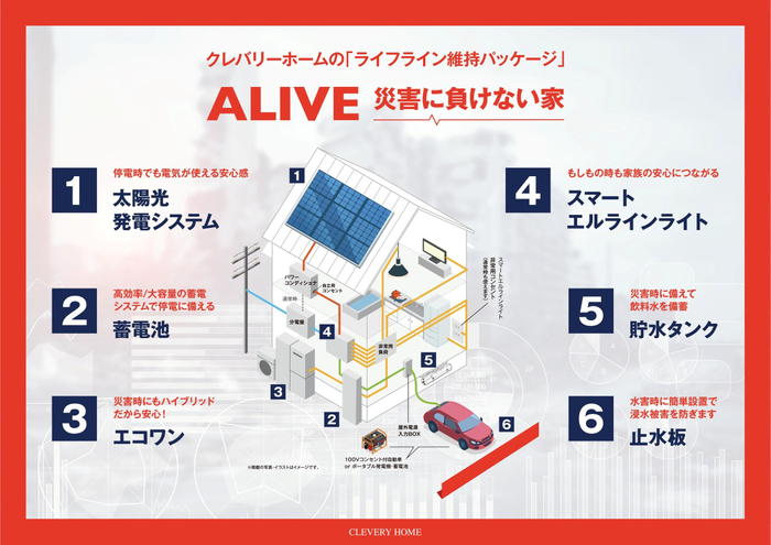 クレバリーホームでは、災害時に避難所へ移動することを前提とするのではなく、自宅で暮らしを継続できる住まいを目指し、防災設備を標準化した「ライフライン維持パッケージ」を展開しています。
