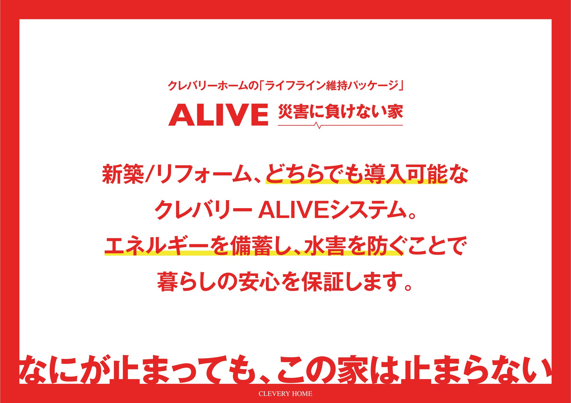 『クレバリーホーム』はこれからも、「自分らしい暮らし」は確かな基本性能があってこそ実現すると考え、メンテナンス性・耐震性・健康性能にこだわった住まいづくりで、ご家族の“しあわせ”と“いのち”を守る家を提供し続けてまいります。