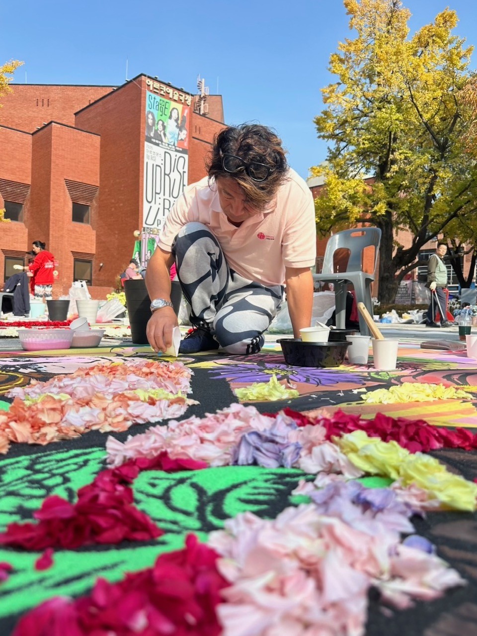 藤川は11月に韓国ソウルで開催された国際大会「International Infiorata Festival ~Blossoming Seoul 2025~」に日本代表として参加、11月9日に帰国しました。世界の花絵師達を唸らせた日本の花絵師が、東京の中心八重洲で新作の公開制作に臨みます。