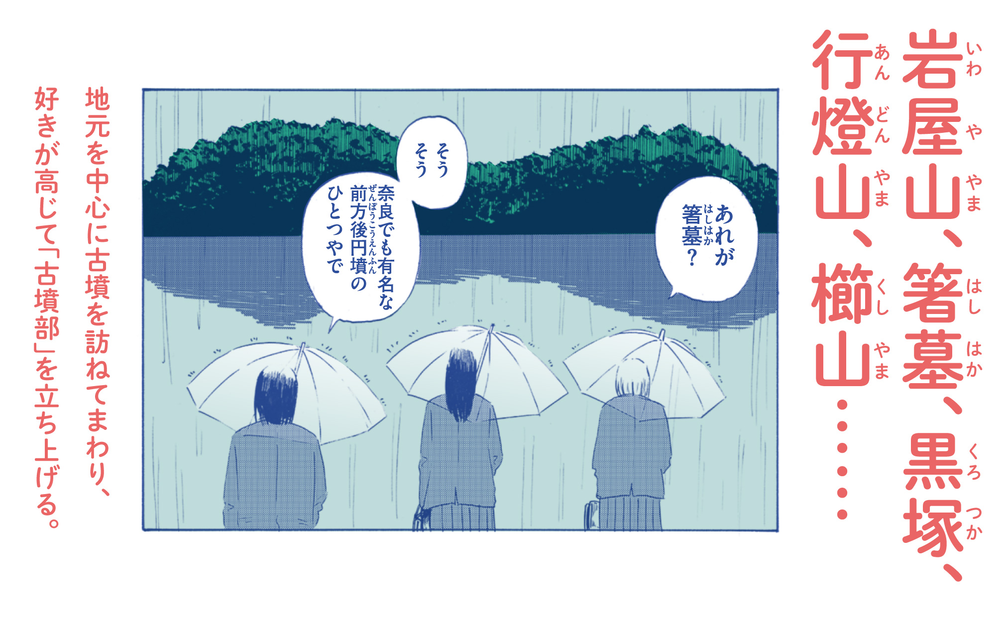 奈良の高校生・埴田麻央(はにま)は古墳めぐりに夢中。岩屋山、箸墓、黒塚、行燈山、櫛山……地元を中心に古墳を訪ねてまわり、好きが高じて「古墳部」を立ち上げる。人間関係や将来に漠然とした不安を抱きながらも、恋に、古墳に、青春まっさかり!