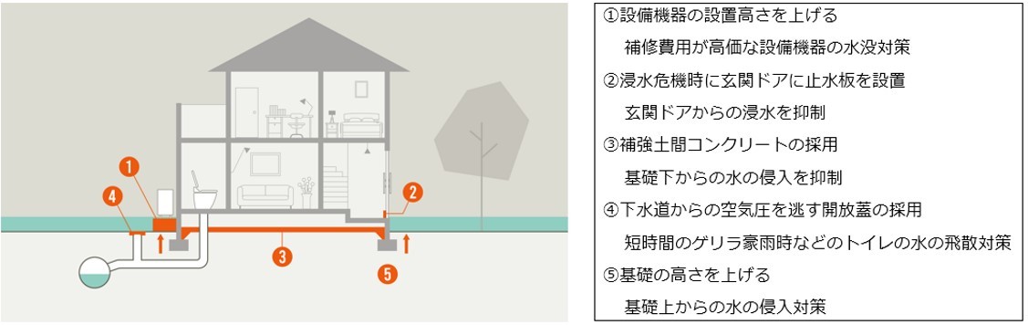 当社では「(1) 設備機器の設置高さを上げる」「(2) 浸水危機時に玄関ドアに止水板を設置」「(3) 補強土間コンクリートの採用」「(4) 下水道からの空気圧を逃す開放蓋の採用」「(5) 基礎の高さを上げる」という5つの対策を組み合わせて床下浸水への対策を強化しました。