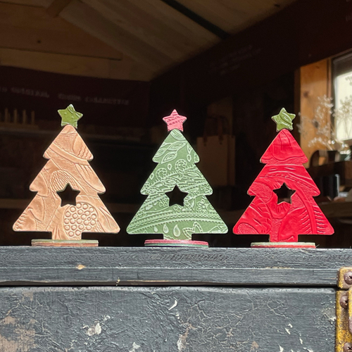 高さ8㎝のミニサイズ!お部屋の片隅に置けるサイズです。2種類の革を選んで張り合わせ、ツリーや星の型を抜き、土台を作って完成です。