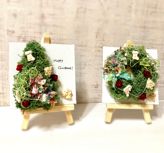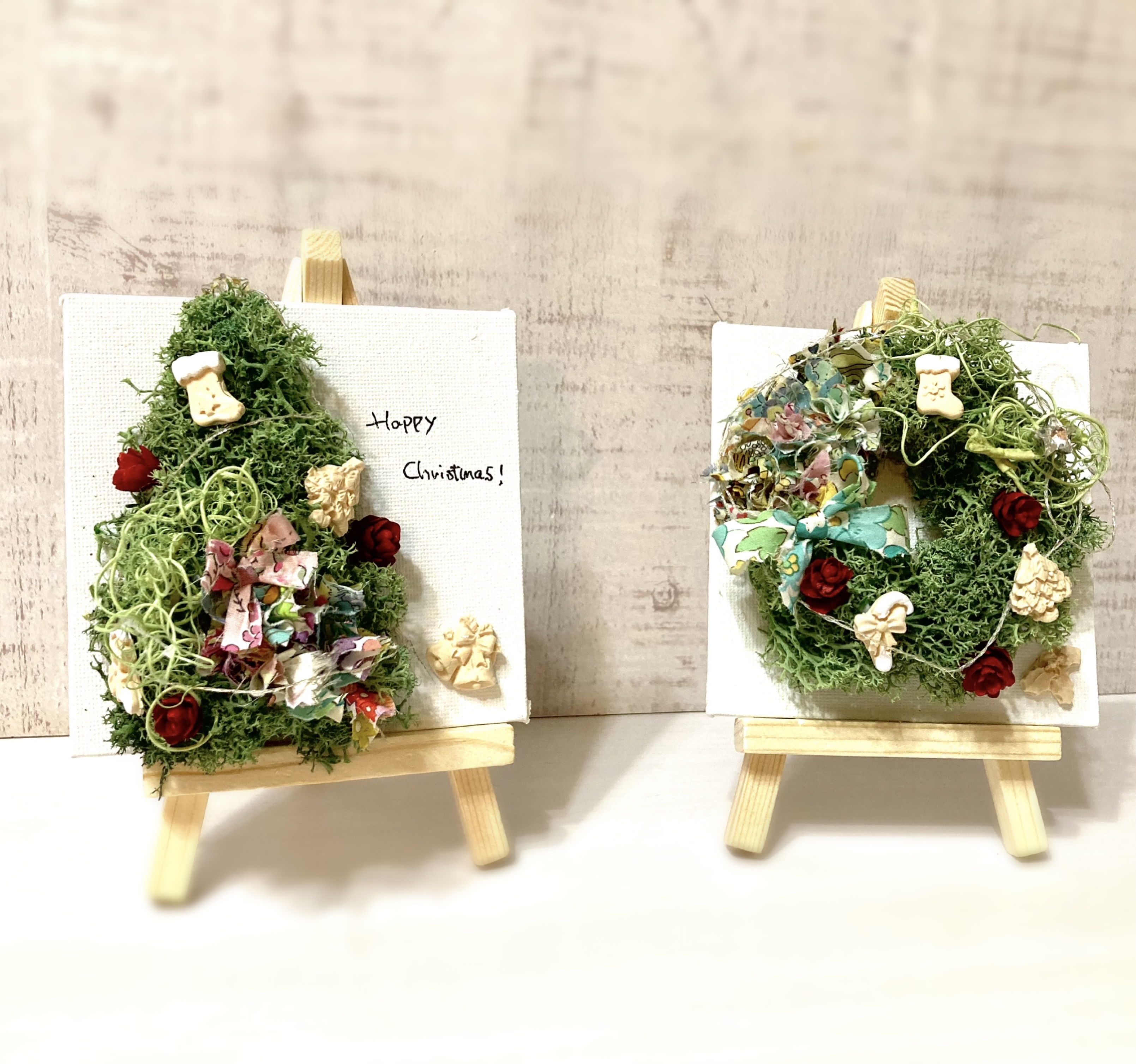 10cm角の小さなキャンバスにフェイクモスとリバティ生地・オーナメント等でツリーやリースを作ります。イーゼルに立てかけてお部屋の片隅に飾っていただけます。