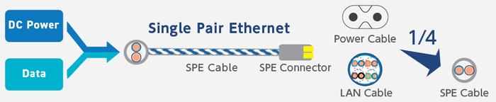 *1:SPEは、IEEEで規格化された技術で自動車向けに使用されており、2030年までに産機や家庭用など既存のアプリケーション向けにも拡大が期待されています。SPEでは1ペアのケーブルでEthernet通信とDC給電を同時に実施でき、さらにケーブル材の使用量を約1/4まで削減することも可能です。