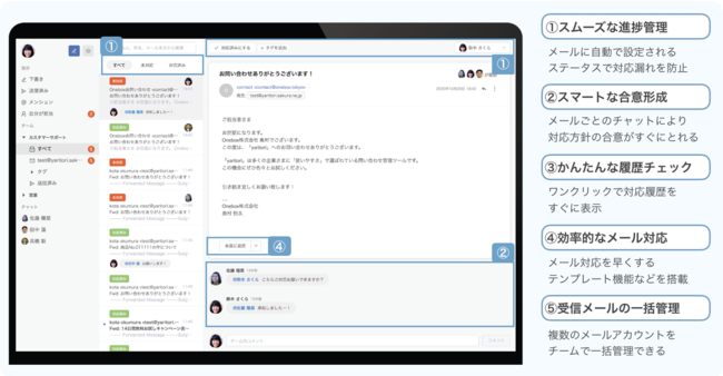 複数メールの対応状況をチームみんなで可視化することができるようになり、メール対応で発生する事故を防止し効率化することが可能になります。