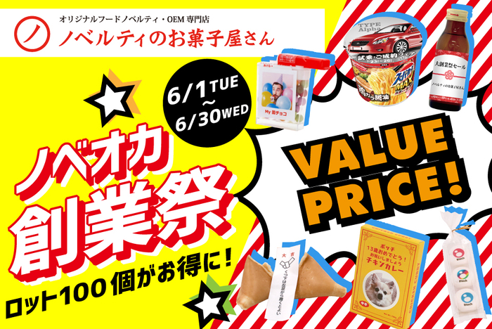 2017年6月のサービス開始以来、製造メーカーによる直接運営ならではの小ロット・短納期を武器に急速に利用者数を伸ばしている【ノベルティのお菓子屋さん】では、毎年6月を創業祭と銘打ち【100個ロット特別価格セール】を実施しています。(※ケース単位での販売商品については、100個前後の数量になる場合がございます)