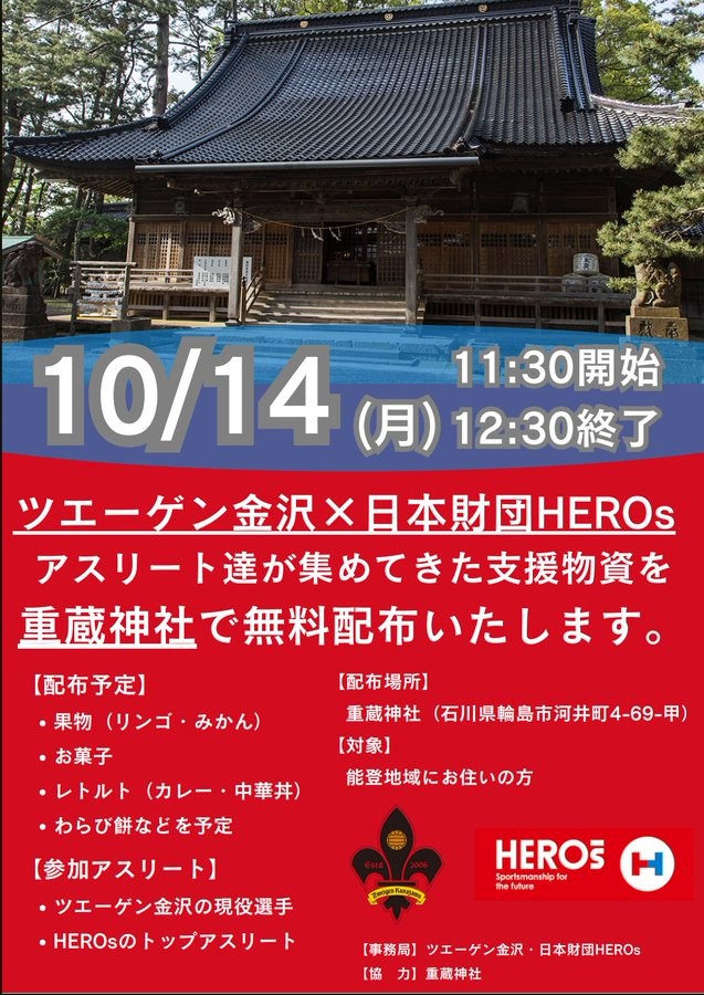 ストラク株式会社(本社:神奈川県横浜市、代表取締役:渡辺大河)(京都利休の生わらび餅)は、2024年10月14日、石川県輪島市の重蔵神社(石川県輪島市河井町4-69-甲)においてツェーゲン金沢の選手10人と日本財団HEROsが輪島で支援活動をしたいというお話を頂き、支援物資配布(生わらび餅)とまた、複数の被災地を周り、「ネリネリわらび餅」イベントを開催しました。