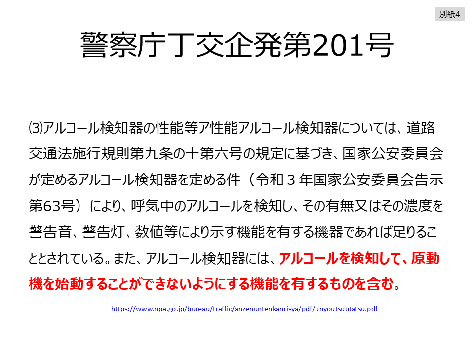 2021年6月28日、千葉県で、悲痛な飲酒運転死亡事故が起きました。加害側が「白ナンバートラック」であったことから、警察庁・公安委員会は、再発防止のため、安全運転管理者選任事業所に対し、アルコール検知器使用を義務付ける道交法施行規則の改正を行い、このなかで、アルコール・インターロック等、車載タイプも、アルコール検知器の一種であるとされました。(別紙 4)