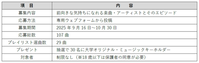 本プロジェクトは、「あと一息頑張りたいとき」「リラックスしたいとき」「気持ちを切り替えたいとき」など、日常のさまざまなシーンで人の背中を押してくれた音楽を共有することで、学内外に前向きな気持ちの輪を広げることを目的とした取り組みです。