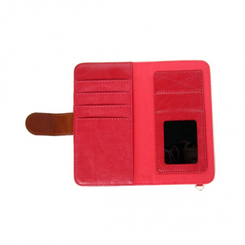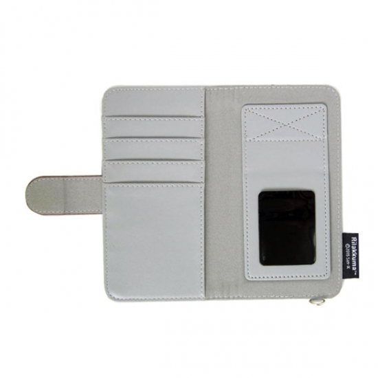 中を開くと、装着部分があります。貼り付けるだけの簡単装着なので、裏側が平らなスマホならOKなんです。画面が5インチ以内のスマホ(参考収容値)なら、装着可能です。プッシュアップスライド式で、装着したままカメラ機能も使える優れものです。左側にはカードなどが収納できるポケットまでついています。