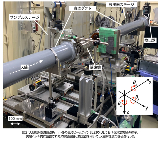 SPring-8の約1 kmの長いビームラインBL29XULを利用して構築されたX線望遠鏡評価システム。宇宙の遠方天体から届くほぼ平行な硬X線を地上で再現し、望遠鏡の性能を高精度に測定できる。